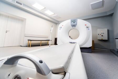 Medical CT or MRI Scan with a patient in the modern hospital laboratory. Interior of radiography department. Technologically advanced equipment in white room. Magnetic resonance diagnostics machine.