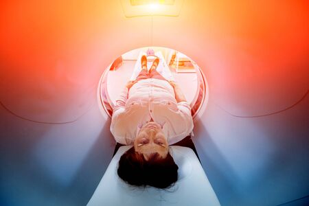 Female patient undergoing MRI - Magnetic resonance imaging in Hospital. Medical Equipment and Health Care concept
