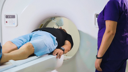 Elderly patient is scanned by MRI, CT scanner at modern hospital.