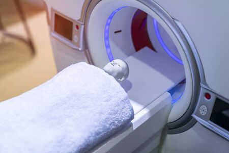 Medical CT or MRI Scan with a patient in the modern hospital laboratory. Interior of radiography department. Technologically advanced equipment in white room. Magnetic resonance diagnostics machine
