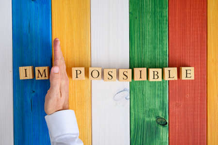 Male hand removing letters IM from the words Impossible spelled on wooden cubes over colourful background.