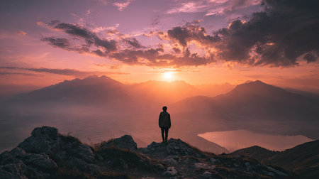 A solitary figure stands silhouetted against a colorful sky, gazing at the sun setting over a misty mountain landscape. A moment of peace and contemplation in nature.