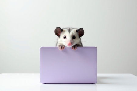 A young opossum sits behind a lavender laptop, looking straight ahead. The minimalist scene combines animal depiction with modern technology and has a playful, humorous touch.