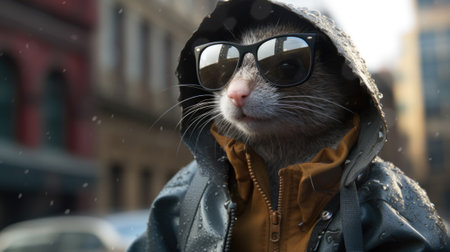 A cool rat or mouse wearing sunglasses and a hoodie. AI