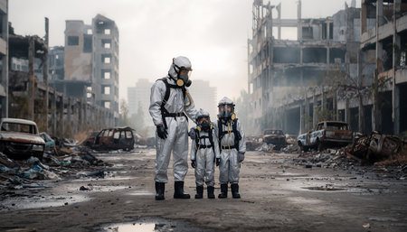 A family wearing protective suits walks through a desolate, war-torn city, highlighting themes of survival, resilience, and environmental disaster.