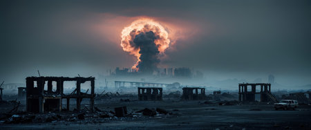 Mushroom cloud rises above a destroyed city in a chilling depiction of nuclear devastation.