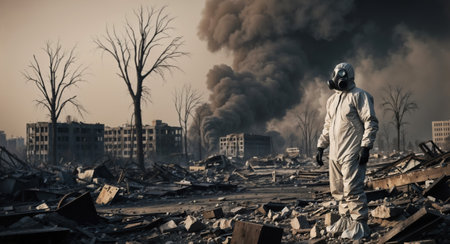 Scientist wearing a hazmat suit is standing in a wasteland surveying the damage after a nuclear fallout.
