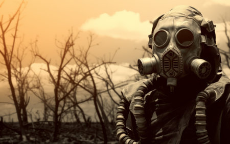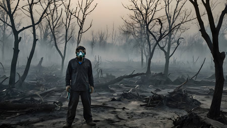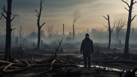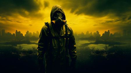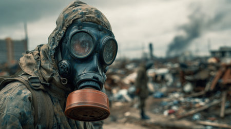 A man in a respirator stands against a smoking factory chimney. garbage around. ai