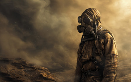 A figure wearing a gas mask navigates through a desolate landscape filled with debris and smoke, highlighting the aftermath of an unknown disaster.