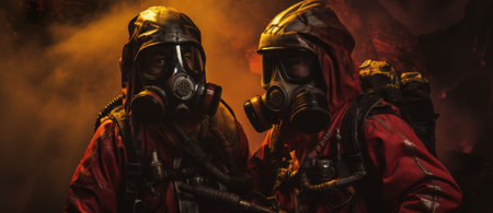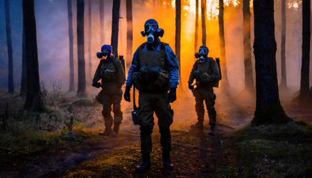 Silhouettes of soldiers wearing gas masks in a foggy dark forest. Generated with AI