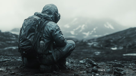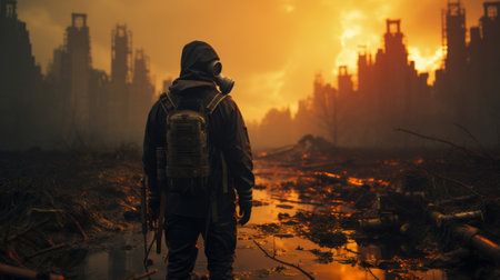 Photo of a stalker in jacket, armored vest standing back view in soviet gas mask with filter on destructed apocalyptic desert wasteland background.
