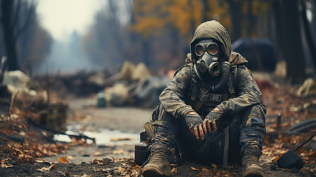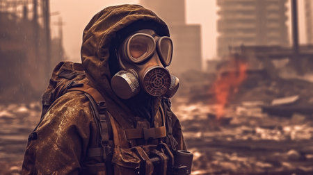 A rugged survivor navigates debris-filled streets in a desolate city while wearing a gas mask for protection against the harsh environment. The atmosphere is eerie and unsettling.