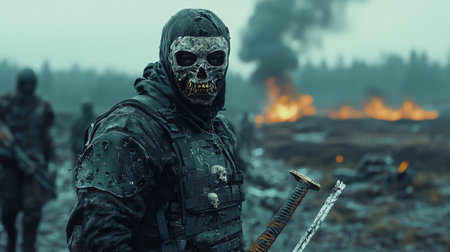 A soldier stands in a desolate environment, wearing a skull mask and tactical gear. Behind them, billowing smoke and flames indicate fierce conflict in a bleak landscape.