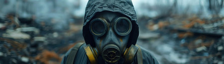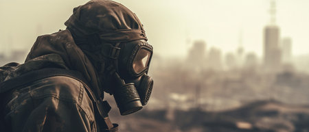 A man in a gas mask on a dramatic background of lifeless ruins. Selective focus.