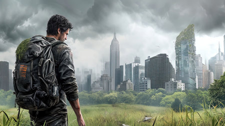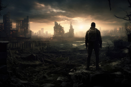 Silhouette of a man with a backpack standing in the middle of a destroyed city, AI Generateda