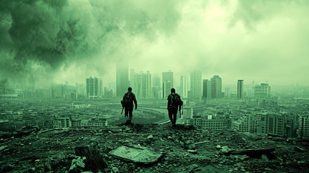 A haunting image of abandoned buildings amidst a decaying city with rugged survivors in survival gear under a dystopian skyline This postapocalyptic scene depicts chaos and resilience