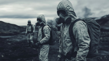 Individuals in biohazard suits with gas masks stand amidst a barren apocalyptic landscape, highlighting the fight for survival in extreme conditions
