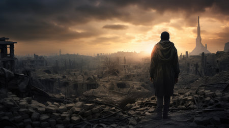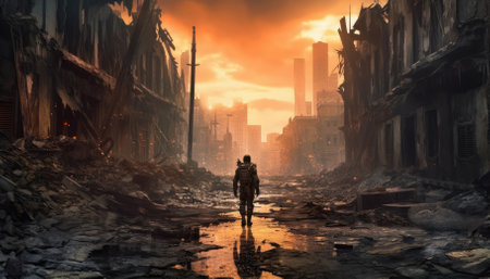 A solitary soldier stands amidst the ruins of a devastated city, surrounded by destruction and signs of a recent battle.