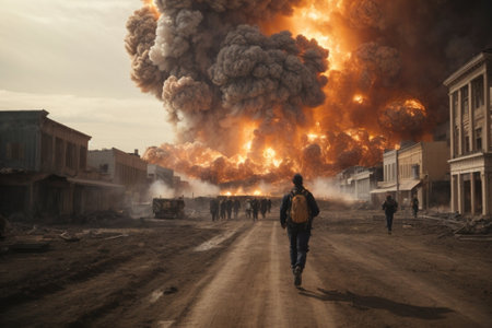 Man with a backpack on the background of the destroyed city. Mixed media, Lone soldier walking in destroyed city, AI Generated