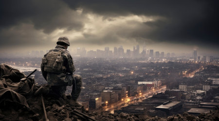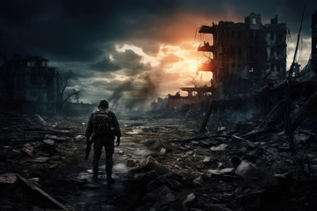 A lone soldier walks in a destroyed city. - image generated with Generative AI