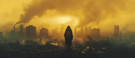 The Impact of Carbon Emissions on Nature: A Small Figure in a Polluted Urban Environment. Concept Environmental Issues, Carbon Emissions, Urban Pollution, Nature Conservation
