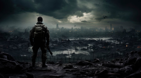Silhouette of a special forces soldier standing in the middle of a destroyed city, Lone soldier walking in a destroyed city, AI Generated