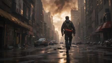 Man walking in the middle of the street in post-apocalyptic scenery.