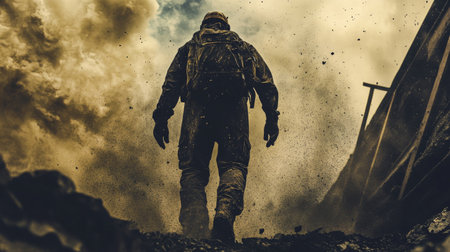 A lone soldier dressed in tactical gear strides through thick dust and debris, emphasizing the chaotic atmosphere of a war zone. The setting sun casts dramatic shadows.