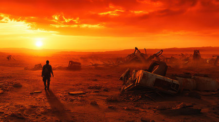 A solitary figure traverses a vast, barren desert filled with the rusted wrecks of advanced machinery, illuminated by a dramatic red sky as the sun sets on the horizon.