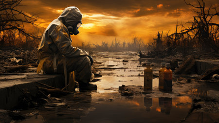 Man in chemical protective suit sitting on the bank of a river at sunset