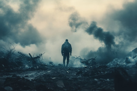 A lone individual traverses a barren and devastated area, enveloped in thick smoke and surrounded by wreckage. The atmosphere is heavy and melancholic, evoking a sense of loss.