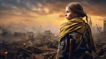 A young female standing in the midst of a derelict urban landscape, AI-generated.