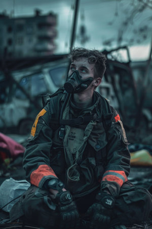 A man in a fireman's uniform sits on the ground with a gas mask on his face