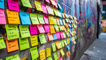 Urban alley wall covered in hundreds of sticky notes with anonymous messages, doodles, and memes, neon spray paint tags in background, gritty texture