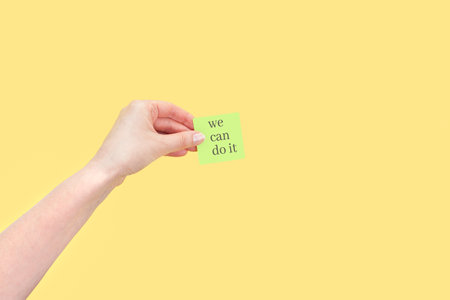 The hand holds a sticky note with inscription We can do it. motivational statement.