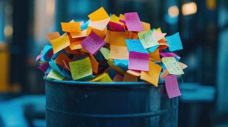 A vibrant pile of colorful sticky notes spilling from a trash can, symbolizing creativity and ideas in an organized chaos. Perfect for themes of brainstorming and innovation.