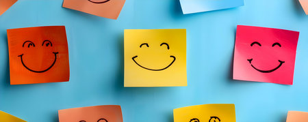 Happiness and Good Mental Health: A Display of Smiling Face Stickers and Sticky Notes. Concept Positive Affirmations, Mindfulness Practices, Journal Prompts, Gratitude Exercises, Self-Care Tips