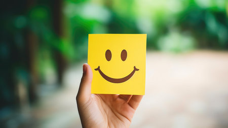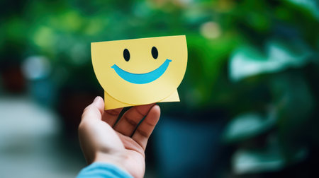 Hand holding paper cut smile face, positive thinking, mental health assessment , world mental health day concep - AI