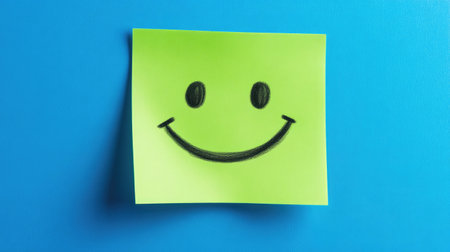 Green sticky note with cheerful smiley face on bright blue background, conveying positivity through bold color contrast and minimal design.