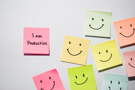 I am productive and smile emoticon on sticky notes. Motivational words for personal development, inspirational handwriting. Isolated on background