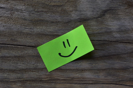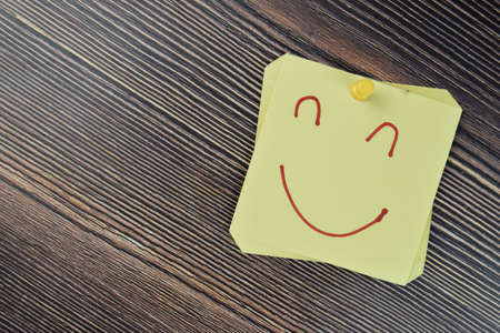Sticker depicting the happy smiley character. Paper sticker pasted on a wooden surface. Self-adhesive paper sheet. A piece of paper on a wooden board. Reminder for action. Paper sheet for notes.