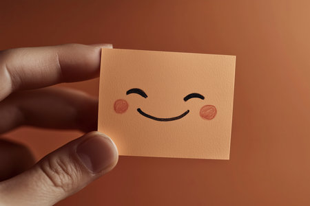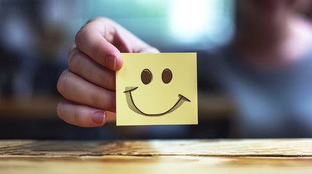 Close-up of a hand holding a small square note featuring a simple, happy emoticon.