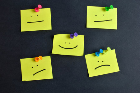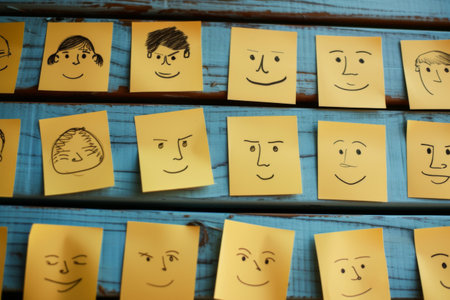 Group of sticky notes with different smiley faces drawn on them, scattered across a bulletin board