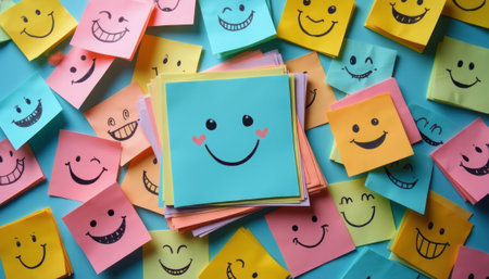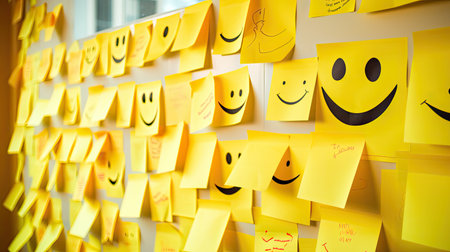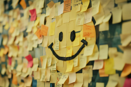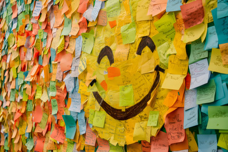 Colorful sticky notes covering a wall, forming a giant smile, conveying positivity and happiness