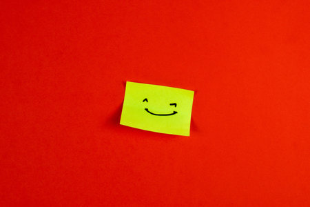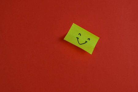 Yellow sticky note with smiley face on red background, conveying positivity through bold color contrast and minimal design.