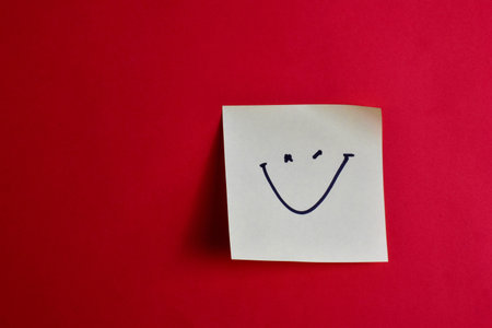 Yellow sticky note with winking smiley face on red background, conveying playful positivity through bold color contrast and minimal design.
