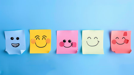 A vibrant array of sticky notes in various colors surrounds a central note featuring a cheerful smiley face, complete with rosy cheeks. This playful composition bursts with positivity, inviting viewers to embrace happiness and spread good vibes through its whimsical expressions.