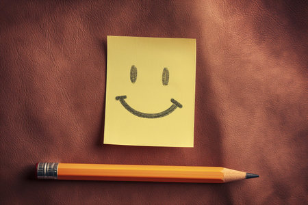 An endearing image suitable for various uses such as mental health awareness, educational content about emotion and expression, or simply as an uplifting visual addition to any personal or professional space | This photograph showcases a simple yet powerful representation of happiness—a hand-drawn smiley face on a bright yellow sticky note. The smiley's black inked eyes and curved upwards mouth impart a sense of joy and positivity. Positioned against a textured red-brown leather background, the yellow of the Post-it note pops, invoking optimism and warmth. The presence of an orange pencil with a well-worn eraser, resting horizontally at the bottom of the image, adds a creative touch, suggesting the potential for human expression and the simplicity of creating a cheerful outlook. The contrast between the organic, worn textures of the pencil and leather, and the cleanliness of the new Post-it, provides an aesthetically pleasing balance between the rustic and the refined, encapsulating a snapshot of analog communication in a digital era | Beneficial for educators and therapists to encourage positive thinking, ideal for office and workspace environments to foster a pleasant atmosphere, or as part of stationery and craft-oriented promotional content. It may also serve as a reassuring and friendly visual for various interactive platforms and social media engagements | a close-up photo of a smiley face drawn on a sticky note, accompanied by an orange pencil on a textured leather surface, conveying joy and simplicity within an everyday setting, with ample space for overlays or text additions