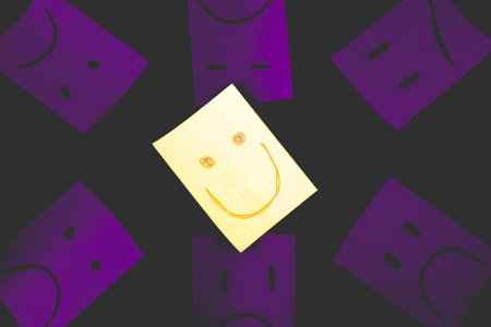 positive attitude or optimism concept - happy smiley face on yellow sticky note surrounded by sad unhappy blue faces