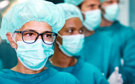 female surgeon doctor wearing protective mask and hat during the operation. Healthcare, medical education, emergency medical service, surgery concept.